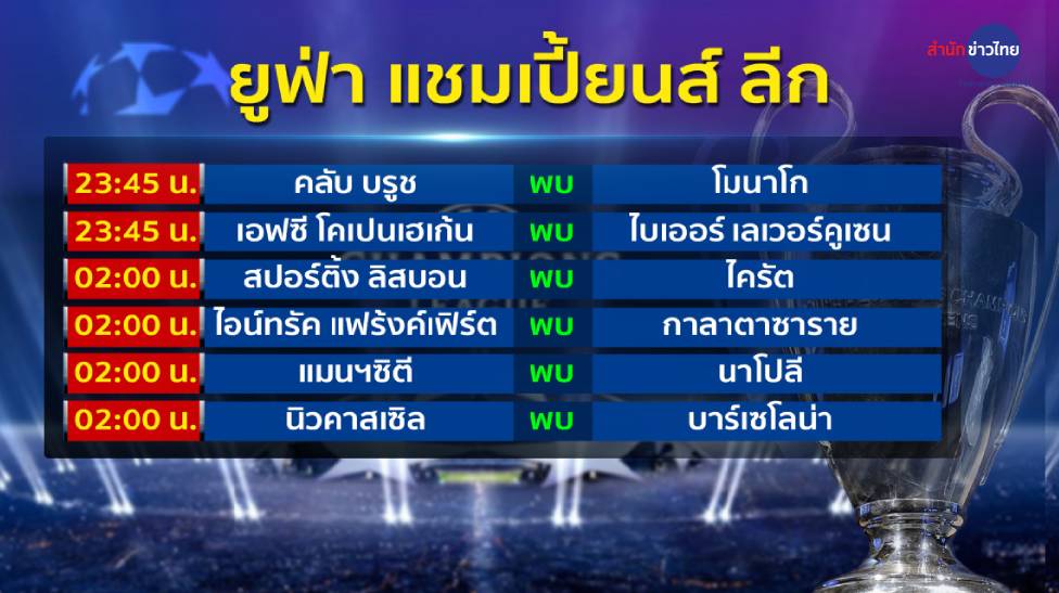 ฟุตบอลยูฟ่า แชมเปียนส์ ลีก รอบลีกเฟส นัดแรก “เรือใบสีฟ้า” แมนฯ ซิตี้ จากอังกฤษ เตรียมเปิดสนาม เอติฮัด สเตเดียม พบ นาโปลี แชมป์กัลโช่ ซีเรีย อา อิตาลี ฤดูกาลที่ผ่านมา เกมนี้ เป๊ป กวาร์ดิโอลา มีปัญหานักเตะเจ็บหลายราย ทั้งโอมาร์ มาร์มูช, ไรยัน แชร์กี, ไรยัน ไอต์-นูรี และมาเตโอ โควาชิช ขณะที่ จอห์น สโตนส์ ก็ต้องเช็กความฟิต อาจจะปรับทีมจากนัดแมนเชสเตอร์ดาร์บี้ โดย ริโก ลูอิส, นาธาน อาเก, นิโก กอนซาเลซ, ออสการ์ บ็อบบ์ และ ซาวินโญ มีลุ้นลงสนามเป็นตัวจริง ส่วนจานลุยจิ ดอนนารุมมา จะลงเฝ้าเสาเหมือนเดิม ขณะที่ตัวหลักในแนวรุกอย่าง ฟิล โฟเดน, เฌเรมี โดกู และเออร์ลิง ฮาลันด์ พร้อมลงล่าตาข่าย