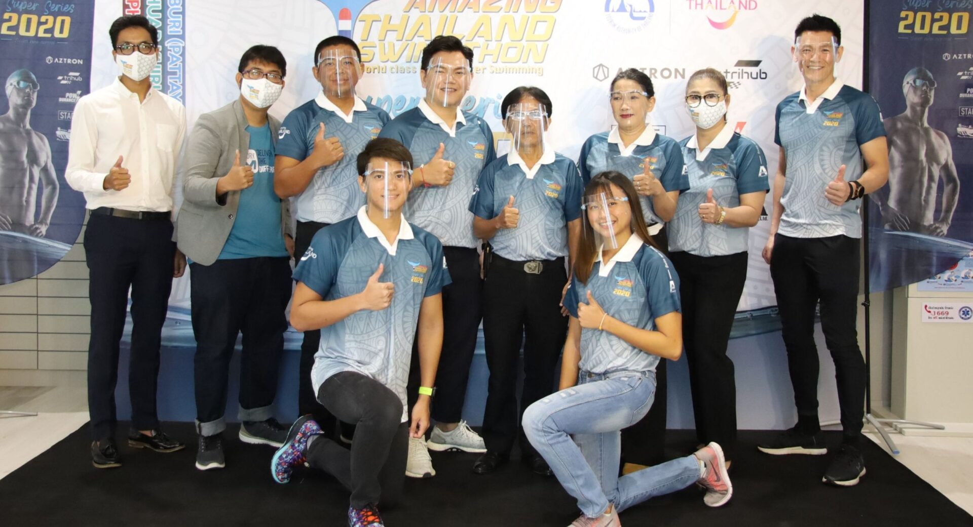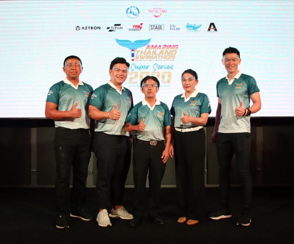 นายอนุศิษย์ สุขประเสริฐ ผู้อำนวยการแข่งขันและกรรมการผู้จัดการ บริษัท เอ ไธร์ฟ จำกัด, นายมนัส ชัยโรจน์สัมพันธ์ ท่องเที่ยวและกีฬาจังหวัดชุมพร, นางแสงจันทร์ แก้วประทุมรัสมี ท่องเที่ยวและกีฬาจังหวัดประจวบคีรีขันธ์ ร่วมแถลงข่าวการแข่งขันว่ายน้ำ “อะเมซิ่ง ไทยแลนด์ สวิมมาธอน ซุปเปอร์ซีรีส์ 2020” ที่ศูนย์ออกกำลังกาย สเตจ ไฟน์ด เดอะ เรียล ยู (ถ.ประดิษฐ์มนูธรรม) เมื่อวันที่ 6 สิงหาคม ที่ผ่านมาโดยมี “น้องโฟน”อารยะ ภูมิจิตอมร, “ต้นข้าว”กตวรรณ ทีฆะ สองนักว่ายน้ำมาราธอนทีมชาติไทย, สุทัช สุทัศน์วงศ์สุขศิริ ManagingDirector&Co-Found Stage Find the real U , อัฐพล ประมวลศิลป์กุล Course Director ร่วมพูดคุย