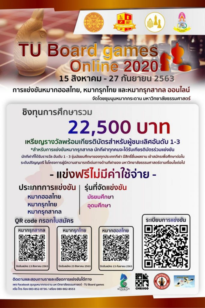 รูปแบบออนไลน์ครั้งแรกในประเทศไทย รายการ “TU Board games Online 2020” ระหว่างวันที่ 15 สิงหาคม – 27 กันยายน 2563 ชิงทุนการศึกษารวม 25,000 บาท สมัครแข่งขันฟรี ไม่มีค่าใช้จ่าย