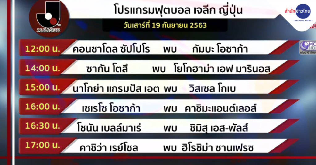 ญี่ปุ่น 18 ก.ย.-วันพรุ่งนี้ช่อง 9 MCOT HD เตรียมถ่ายทอดสดฟุตบอลเจลีก คอนซาโดเล ซัปโปโร เปิดบ้านพบ กัมบะ โอซาก้า เวลาเที่ยงตรง