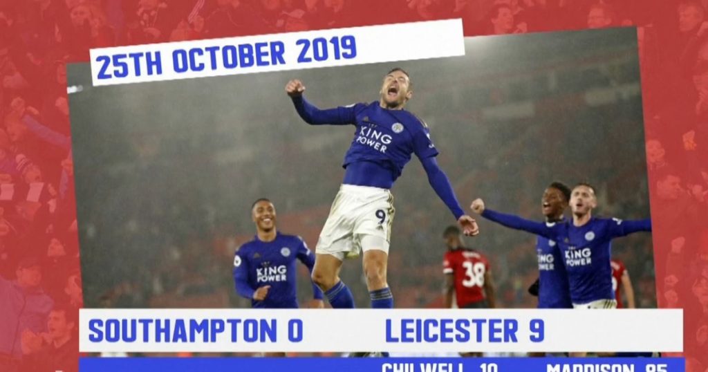 อันดับ 2 เมื่อวันที่ 25 ตุลาคม ปี 2019 เลสเตอร์ ซิตี้ บุกไปถล่ม เซาธ์แฮมป์ตัน ถึงถิ่น เซนต์แมรี 9-0 นัดนี้ เจมี วาร์ดี กับ อโยเซ เปเรซ ซัดแฮตทริกให้ “จิ้งจอกสยาม”