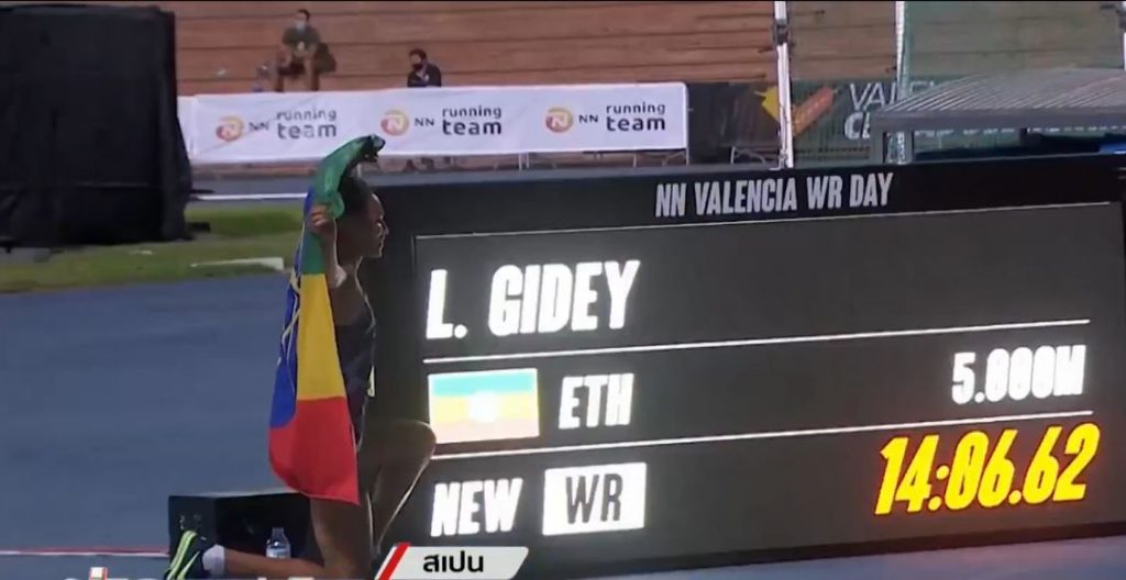 การแข่งขันกรีฑาชิงแชมป์โลกที่บาเลนเซีย ประเทศสเปน วิ่ง 5,000 เมตรหญิง เลเตเซนเบต กิดีย์ นักวิ่งชาวเอธิโอเปีย วัย 22 ปี ทำลายสถิติโลกของ ติรุเนสซ์ ดิบาบา เพื่อนร่วมชาติที่ทำสถิติโลกในออสโล ประเทศนอร์เวย์ เมื่อปี 2008 ไปได้ ทำเวลา 14 นาที 11 จุด 1 วินาที เร็วกว่า ดิบาบา ที่ทำไว้ 4.5 วินาที