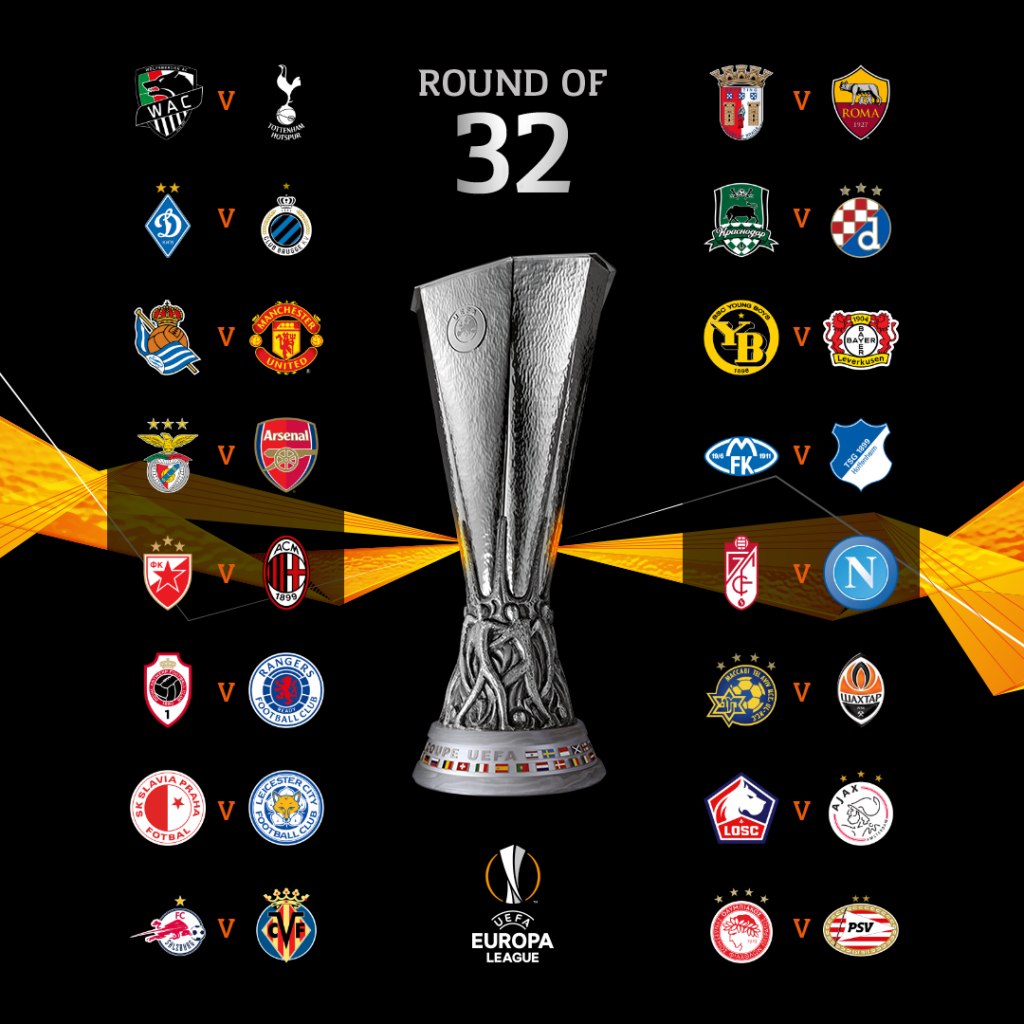 ผลการจับสลากประกบคู่ฟุตบอล ยูโรป้า ลีก รอบ 32 ทีมสุดท้าย ที่เมืองนียง ประเทศสวิตเซอร์แลนด์ เมื่อวันจันทร์ที่ผ่านมา แมนเชสเตอร์ ยูไนเต็ด จากอังกฤษ เจองานหนักเมื่อถูกจับไปชน รีล โซเซียดัด จากสเปน ส่วน อาร์เซนอล จะพบกับ เบนฟิก้า จากโปรตุเกส