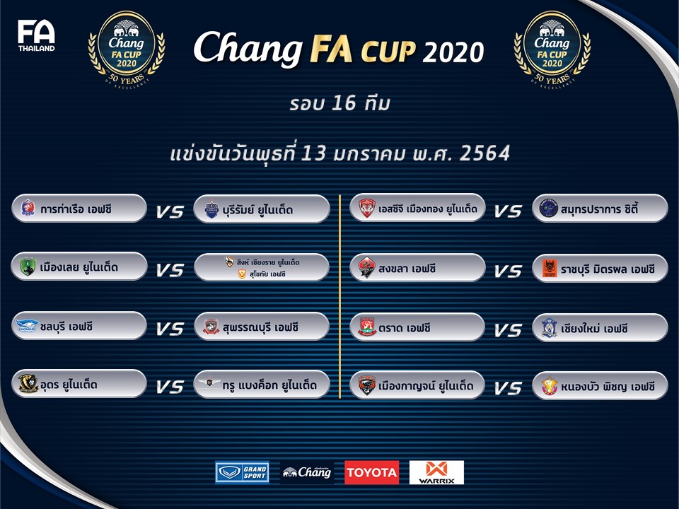 ทั้งนี้ การแข่งขัน ช้าง เอฟเอ คัพ 2020 รอบ 16 ทีมสุดท้าย จะแข่งขันในวันที่ 13 มกราคม 2564.-สำนักข่าวไทย