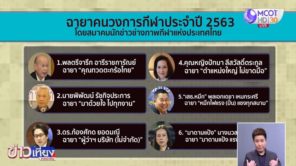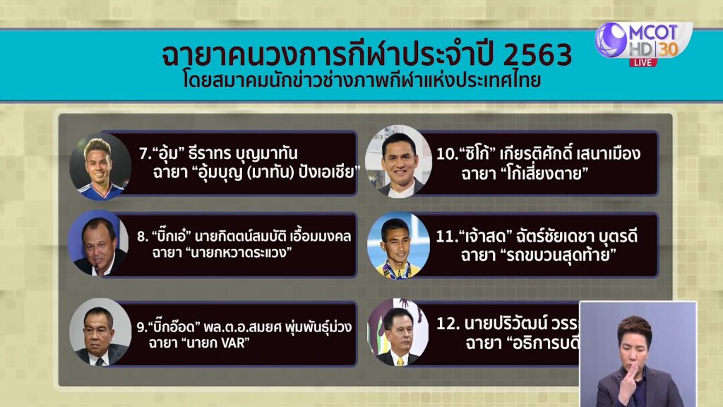 1 ม.ค.-สมาคมนักข่าวช่างภาพกีฬาแห่งประเทศไทย ได้คัดเลือกและตั้ง 12 ฉายาคนวงการกีฬาประจำปี 2563