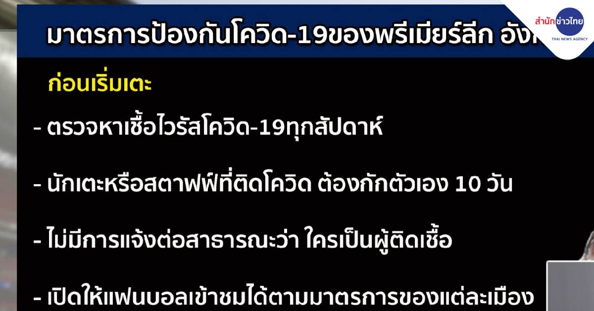ส่วนมาตรการป้องกันโควิด ที่น่าสนใจของลีกยอดนิยม อย่างพรีเมียร์ลีก อังกฤษ ที่นอกเหนือจากการเตะแบบปิด มีหลายเรื่องที่น่าสนใจ และลีกบ้านเเราอาจจะยึดเป็นแบบอย่างได้ ก่อนเริ่มเตะจะตรวจหาเชื้อโควิด-19 จากนักเตะและสตาฟฟ์กว่า 1,600 คน ทุกสัปดาห์