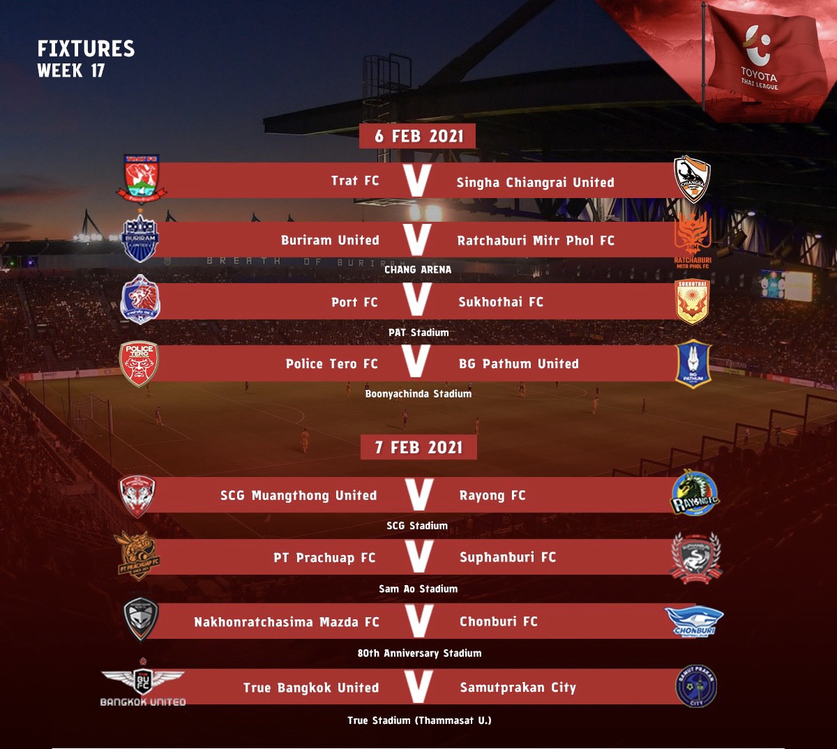 โปรแกรมการแข่งขัน ไทยลีก 1 นัดที่ 17 มีดังนี้