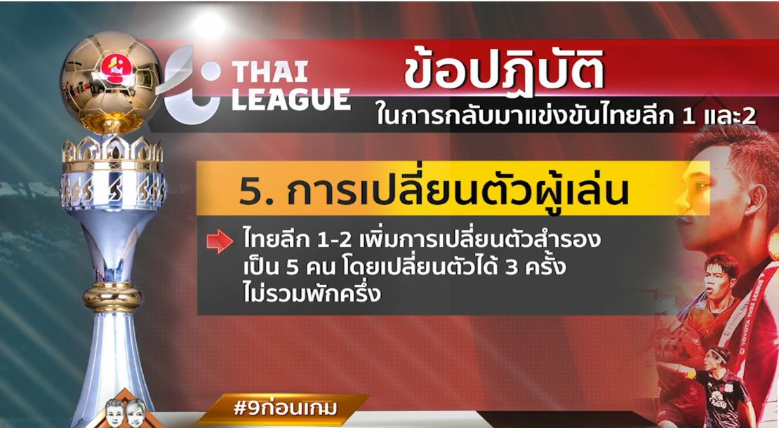 ขณะที่กติกาในสนามมีการออกกฎเพิ่มมาในข้อที่ 5.คือการเปลี่ยนตัวผู้เล่น- ไทยลีก 1-2 เพิ่มการเปลี่ยนตัวสำรองเป็น 5 คน โดยเปลี่ยนตัวได้ 3 ครั้ง ไม่รวมพักครึ่ง