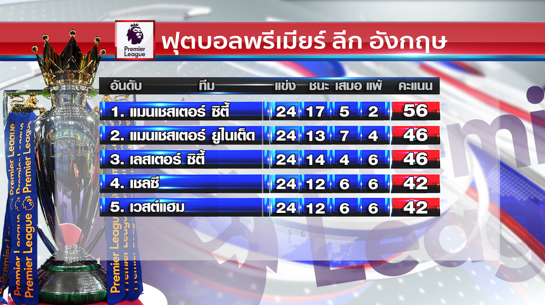 ด้านผลฟุตบอลพรีเมียร์ลีก อังกฤษ นัดตกค้างเมื่อคืนที่ผ่านมา “เรือใบสีฟ้า” แมนเชสเตอร์ ซิตี้ บุกไปเอาชนะ เอฟเวอร์ตัน ถึงถิ่น กูดิสัน ปาร์ค 3-1 โดยแมนฯ ซิตี้ ขึ้นนำ 1-0 จากการยิงของ ฟิล โฟเด้น ในนาทีที่ 32 แต่ เอฟเวอร์ตัน ตีเสมอในนาทีที่ 37 จาก ริชาร์ริสัน ก่อนที่ เรือใบสีฟ้า จะขึ้นนำอีกครั้งจาก ริยาด มาห์เรซ นาทีที่ 63 และได้ประตูตอกย้ำชัยชนะจาก แบร์นาร์โด้ ซิลวา ในนาทีที่ 77 แมนฯ ซิตี้ ทำสถิติชนะเกมลีกสูงสุด 10 นัดติดต่อกันนับตั้งแต่เริ่มปีใหม่ โดยยังนำเป็นจ่าฝูง แข่ง 24 นัด มีเพิ่มเป็น 56 คะแนน ทิ้งห่างอันดับ 2 แมนฯ ยูไนเต็ด 10 คะแนน ส่วนเอฟเวอร์ตัน แข่ง 23 นัดมี 37 คะแนนอยู่อันดับที่ 7