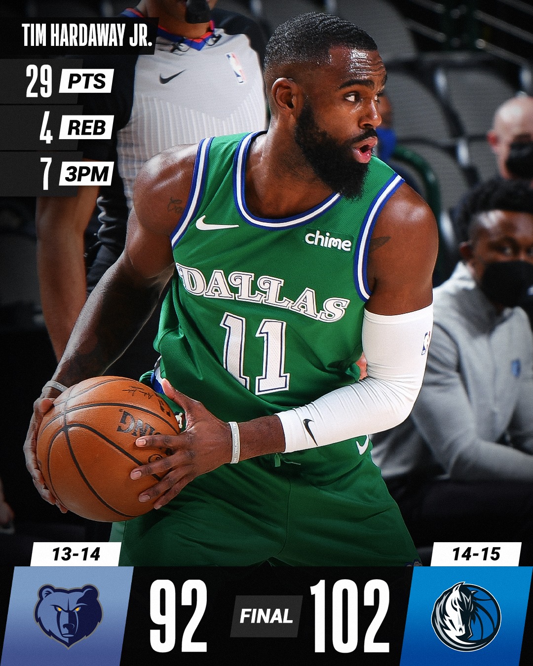 โดยเกมนี้ แมฟเวอริกส์ ได้ ทิม ฮาดาเวย์ สมอลฟอร์เวิร์ดตัวเก่ง ทำไป 29 คะแนน กับ 4 รีบาวด์และ พอยต์การ์ด ลูก้า ดอนซิช ทำอีก 21 แต้ม 7 รีบาวด์ 5 แอสซิสต์ ช่วยให้ทีม ดัลลัส แมฟเวอริกส์ ชนะ เมมฟิส กริซลีส์ 102-92 คะแนน เก็บชัยชนะ ครั้ง ที่ 14 อยู่อันดับ 9 ของสาย ส่วน เมมฟิส กริซลีส์ แพ้เป็นครั้งที่ 14 รั้งอันดับ 10 ของตาราง