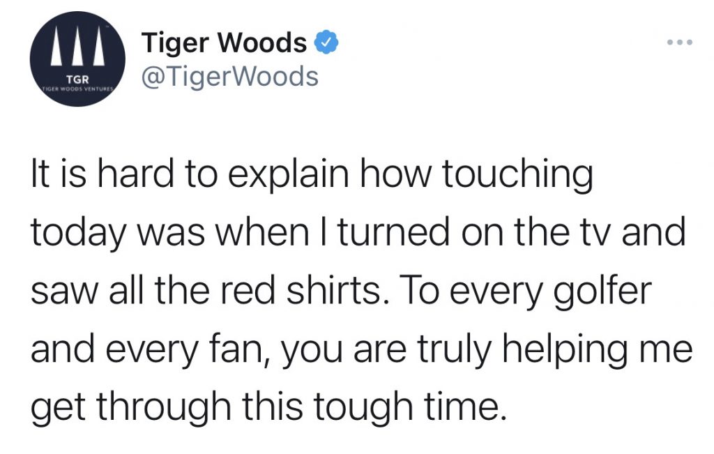 “มันยากที่จะอธิบายว่าวันนี้รู้สึกอย่างไร เมื่อเปิดทีวีและเห็นคนทั้งหมดสวมเสื้อสีแดง สำหรับนักกอล์ฟทุกคนและแฟน ๆ ทุกคน คุณช่วยให้ผมผ่านช่วงเวลาที่ยากลำบากนี้ไปได้”