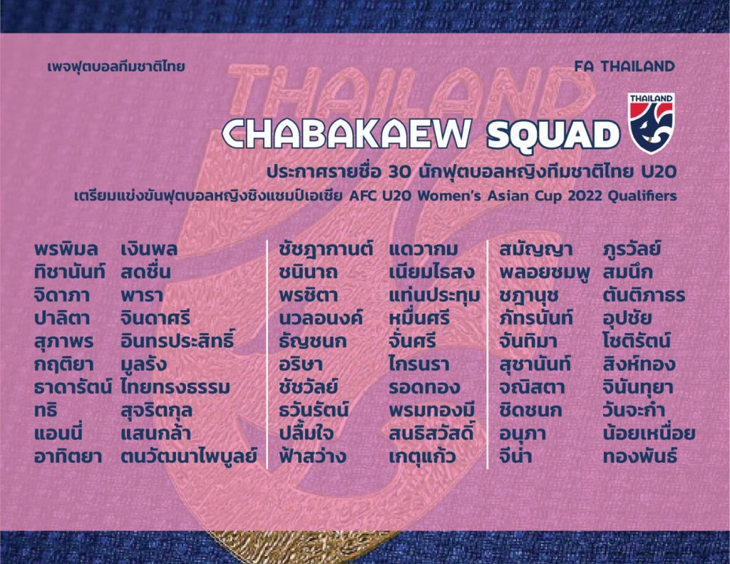 1 มี.ค. 64.-สมาคมกีฬาฟุตบอลแห่งประเทศไทย ในพระบรมราชูปถัมภ์ ทำการประกาศรายชื่อ 30 นักฟุตบอลหญิงทีมชาติไทย รุ่นอายุไม่เกิน 20 ปี เข้าเเคมป์เก็บตัวครั้งที่ 1 ระหว่างวันที่ 8 – 17 มีนาคม 2564 ณ ศูนย์พัฒนาศักยภาพกีฬาฟุตบอล มหาวิทยาลัยกรุงเทพธนบุรี เพื่อเตรียมความพร้อมสำหรับการแข่งขันฟุตบอลหญิงชิงแชมป์เอเชีย รอบคัดเลือก ซึ่งมีกำหนดจัดการแข่งขันในระหว่างวันที่ 14 – 22 สิงหาคม 2564