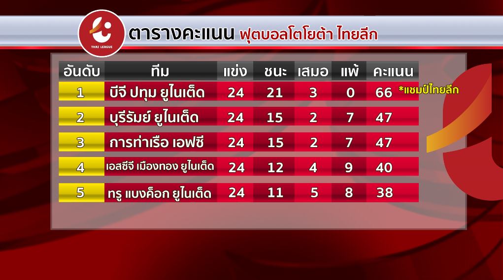 ไทยลีกนัดที่ 24 “เดอะ แรบบิท” บีจี ปทุม ยูไนเต็ด จ่าฝูง เปิดบ้านรับการมาเยือนของ “ค้างคาวไฟ” สุโขทัย เอฟซี ทีมอันดับ 13 เริ่มเกมได้ 6 นาทีเจ้าบ้านก็ได้ประตูขึ้นนำจากได้ฟรีคิกที่ฝั่งซ้าย สุมัญญา ปุริสาย เปิดไปหน้าประตู อันเดรียส ตูเญซ ทำท่าจะโฉบโหม่ง แต่ สุโขทัย เอฟซี เสียจังหวะ บอลผ่านเข้าไปเป็นประตูขึ้นนำ 1-0 ในช่วงครึ่งหลัง บีจี ปทุม ก็มาได้ประตูชัย 2-0 ในนาทีที่ 63 จากลูกจุดโทษของ วิคเตอร์ การ์โดโซ จบเกม บีจี ปทุม ยูไนเต็ด ชนะ สุโขทัย เอฟซี 2-0 ทำให้ บีจี ปทุม คว้าแชมป์แรกเป็นประวัติศาสตร์สโมสร ส่วน สุโขทัย เอฟซี ยังคงลุ้นหนีตกชั้นต่อไป