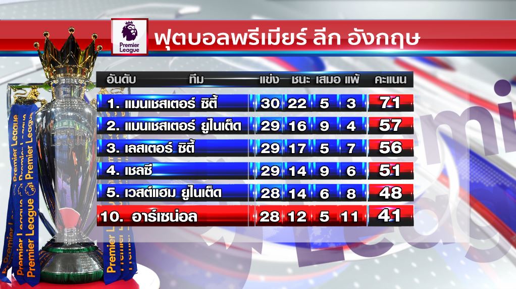 ส่วน “ปีศาจแดง” แมนเชสเตอร์ ยูไนเต็ด ทีมอันดับ 3 เปิดบ้านพบเวสต์แฮม ยูไนเต็ด ทีมอันดับ 5 โดยปีศาจแดงได้ประตูขึ้นนำ จากการที่ เคร็ก ดอว์สัน ทำเข้าประตูตนเอง ในนาทีที่ 53 จบเกม ปีศาจแดง แมนเชสเตอร์ ยูไนเต็ด เฉือนเอาชนะ เวสต์แฮม ยูไนเต็ด 1-0 โดยชัยชนะในนัดนี้ทำให้แมนฯ ยู ไร้พ่าย 13 นัดติดรวมทุกรายการและเก็บคะแนนเพิ่มเป็น 57 คะแนน จาก 29 นัดรั้งรองจ่าฝูง ตามหลังจ่าฝูง แมนเชสเตอร์ ซิตี้ 14 คะแนน โดยในนัดต่อไป แมนฯ ยู มีคิวบุกไปเยือน เอซี มิลาน ในศึกยูโรปาลีก