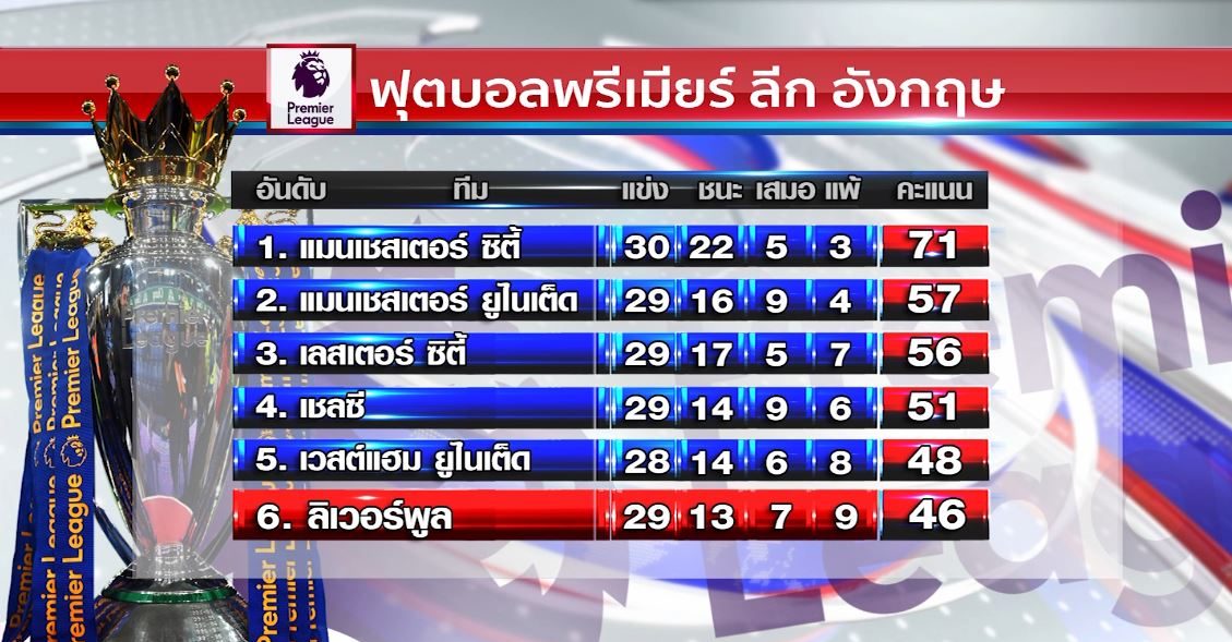 สรุปตารางคะแนนล่าสุด อันดับ 1 แมนฯ ซิตี้ เตะ 30 นัด มี 71 คะแนน ทิ้งห่าง แมนฯ ยู ที่เตะน้อยกว่า 1 นัด 14 คะแนน อันดับ 3 เลสเตอร์ 56 คะแนน อันดับ 4 เชลซี 51 คะแนน อันดับ 5 เวสต์แฮม 48 คะแนน และอันดับ 6 ลิเวอร์พูล 46 คะแนน.-สำนักข่าวไทย