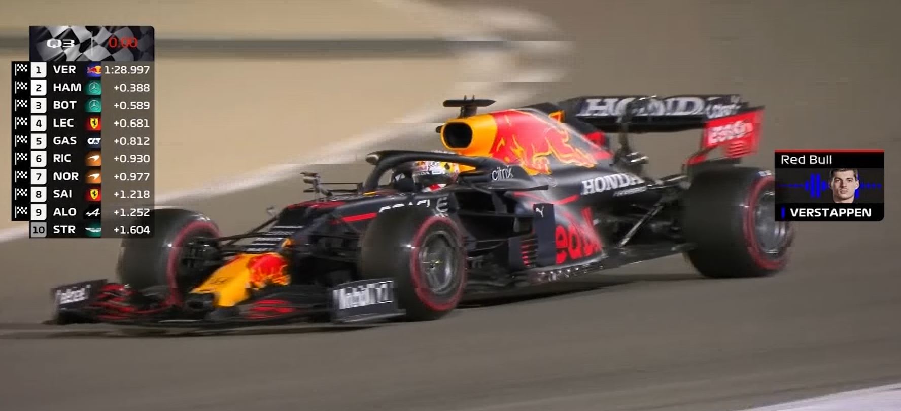 ศึกรถสูตรหนึ่งชิงแชมป์โลก หรือฟอร์มูลา วัน เปิดฤดูกาล 2021 รายการ “บาห์เรน กรังปรีซ์” ที่ประเทศบาห์เรน รอบควอลิฟาย แม็กซ์ เวอร์สแตพเพน นักขับจากทีม เรดบูลล์ เรซซิง คว้าโพล โพซิชัน เป็นครั้งที่ 4 ด้วยเวลาต่อรอบเร็วที่สุด 1 นาที 28.997 วินาที เฉือนอันดับ 2 ลูอิส แฮมิลตัน แชมป์โลก 4 สมัยชาวอังกฤษจากทีมเมอร์เซเดส 0.388 วินาที โดยมีวัลต์เทรี บอตทาส เพื่อนร่วมทีม แฮมิลตัน อยู่อันดับ 3 ช้ากว่า เวอร์สแตพเพน 0.589 วินาที และ ชาร์ลส เลอแคลร์ นักขับความหวัง เฟอร์รารี อยู่อันดับ 4 โดยเวอร์สแตพเพน นักขับชาวดัตช์ กำลังลุ้นแชมป์ที่ 11 ในชีวิต ส่วนแฮมิลตัน ลุ้นแชมป์ที่ 96 สำหรับรอบชิงชนะเลิศจะมีขึ้นในวันนี้เวลา 22.00 น.-สำนักข่าวไทย