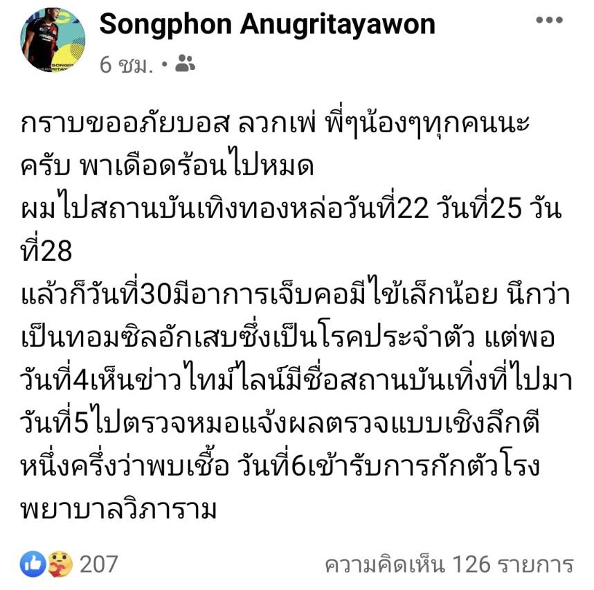 7 เม.ย.64 กรุงเทพฯ- ทรงพล อนุกฤตยาวรรณ อดีตนักแบดมินตันคู่ผสมทีมชาติไทย ได้โพสเฟซบุ๊คส่วนตัว กราบขออภัยบอส ลวกเพ่ พี่ๆน้องๆทุกคนนะครับ พาเดือดร้อนไปหมดผมไปสถานบันเทิงทองหล่อวันที่22 วันที่25 วันที่28 แล้วก็วันที่30มีอาการเจ็บคอมีไข้เล็กน้อย นึกว่าเป็นทอมซิลอักเสบซึ่งเป็นโรคประจำตัว