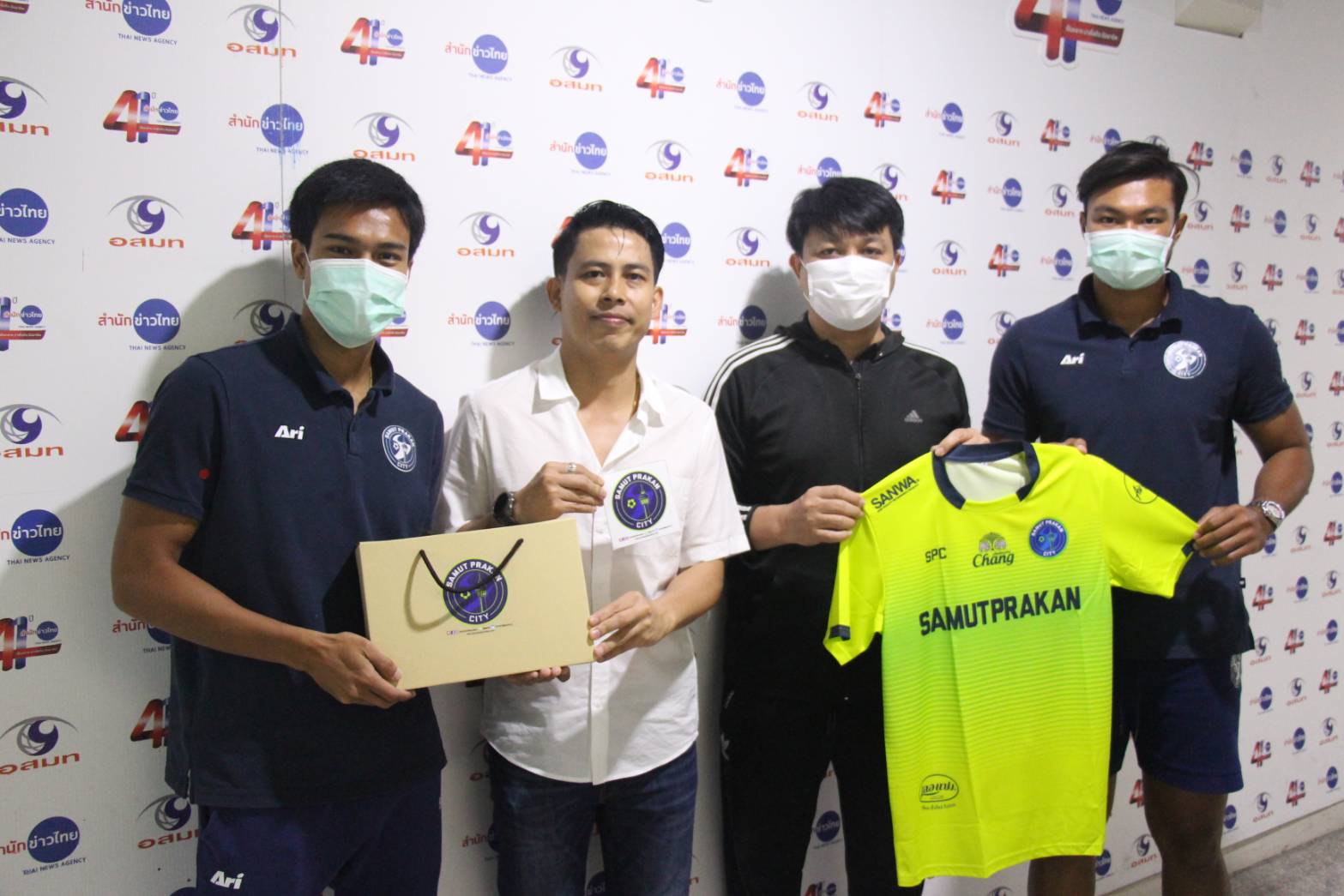 7 เม.ย.64 กรุงเทพฯ-ชญาวัต ศรีนาวงษ์ และศุภวัฒน์ โยคะกุล 2 นักเตะ”เขี้ยวสมุทร”สมุทรปราการซิตี้ ทีมในไทยลีก ที่จบอันดับ 6 ด้วยผลงาน แข่ง 30 นัด ชนะ 14 เสมอ 5 แพ้ 11 มี 47 คะแนน ได้มาขอบคุณทีมข่าวกีฬาสำนักข่าวไทย อสมท.ที่นำเสนอข่าวและที่ได้ร่วมถ่ายทอดสดฟุตบอลไทยลีกให้แฟนบอลชาวไทยได้ชมฟรี พร้อมนำปลาสลิดของดีจังหวัดสมุทรปราการ มาประชาสัมพันธ์
