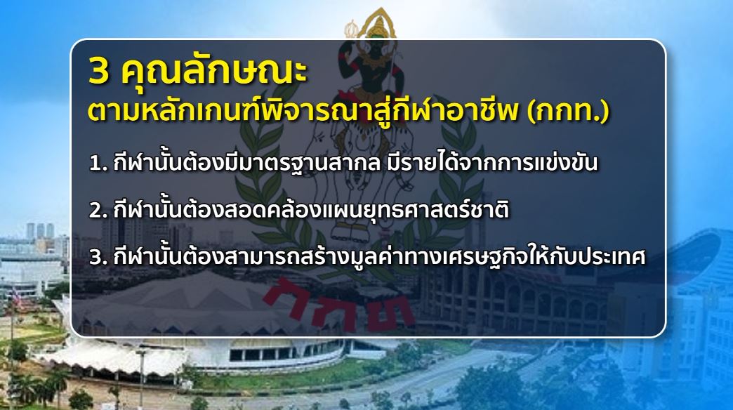 สำหรับการกีฬาแห่งประเทศไทย แน่นอนว่าการพัฒนาคงจะไม่หยุดเพียงเท่านี้ อนาคตจะเดินหน้าผลักดันกีฬาอื่นๆ เข้าสู่กีฬาอาชีพ หากผ่าน 3 คุณลักษณะตามหลักเกนฑ์ที่จะพิจารณาสู่กีฬาอาชีพได้ 1.กีฬานั้นต้องมีมาตรฐานสากล มีรายได้จากการแข่งขัน ตามที่คณะกรรมการกีฬาอาชีพกำหนด 2.กีฬานั้นต้องสอดคล้องแผนยุทธศาสตร์ชาติ (มีพื้นที่เล่นสม่ำเสมอ) 3.กีฬานั้นต้องสามารถสร้างมูลค่าทางเศรษฐกิจให้กับประเทศ.-สำนักข่าวไทย