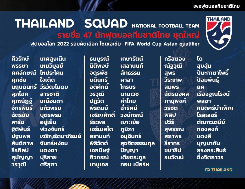 12 เม.ย.64-กรุงเทพฯ-อากิระ นิชิโนะ หัวหน้าผู้ฝึกสอนทีมชาติไทย ประกาศรายชื่อ 47 นักเตะช้างศึก เพื่อเรียกตัวเข้าแคมป์ฝึกซ้อมเตรียมพร้อม สำหรับการแข่งขันฟุตบอลโลก 2022 รอบคัดเลือก โซนเอเชีย รอบ 2 ในสามนัดสำคัญ ที่ประเทศสหรัฐอาหรับเอมิเรตส์ ในช่วงเดือนมิถุนายน โดยมีชื่อของ “กัน” ธนวัฒน์ ซึ้งจิตถาวร นักเตะไทยในทีมเลสเตอร์ ซิตี้ ชุดใหญ่อย่างไรก็ตาม “กัน” ที่ย้ายไปเติบโตที่ประเทศฝรั่งเศสเคยติดทีมชาติฝรั่งเศส ชุดอายุไม่เกิน 16 และ 17 ปีมาแล้ว