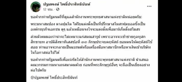 อย่างไรก็ตาม เรื่องนี้อาจกลายเป็นดราม่า เพราะล่าสุดนายปฐมพงษ์ โพธิ์ประสิทธินันท์ นักวิชาการทางบูรพคดีศึกษา มหาวิทยาลัยมหิดล โพสต์ข้อความว่า ฝากรัฐมนตรีที่ดูแลสำนักงานพระพุทธศาสนาแห่งชาติ หน่อยครับ พระมหาสมปอง ตาลปุตฺโต ได้รับแต่งตั้งเป็นที่ปรึกษาสโมสรฟุตบอล ซึ่งเป็นองค์กรธุรกิจเอกชน ดูแล้วเหมือนจงใจจะแต่งตั้งเพื่อมาร์เก็ตติ้งสโมสร ส่วนตัวผมมองว่าน่าจะไม่เหมาะแก่สมณสารูป เพราะอาจเข้าข่ายกูลทูสกสิกขาบท อาบัติสังฆาทิเสสข้อที่ 13 ภิกษุประจบคฤหัสถ์ ยอมตนให้คฤหัสถ์ใช้สอย อาจกลายเป็นแบรนด์หรือเครื่องมือหาสมาชิกหรือหาเงินเข้าบริษัทในโอกาสต่อไปได้ จึงฝากเร่งรัดให้สำนักงานพระพุทธศาสนาแห่งชาติ นำเสนอคณะกรรมการมหาเถรสมาคม ก่อนที่พระภิกษุรูปอื่นๆ จะถือเป็นเยี่ยงอย่างต่อไป.-สำนักข่าวไทย