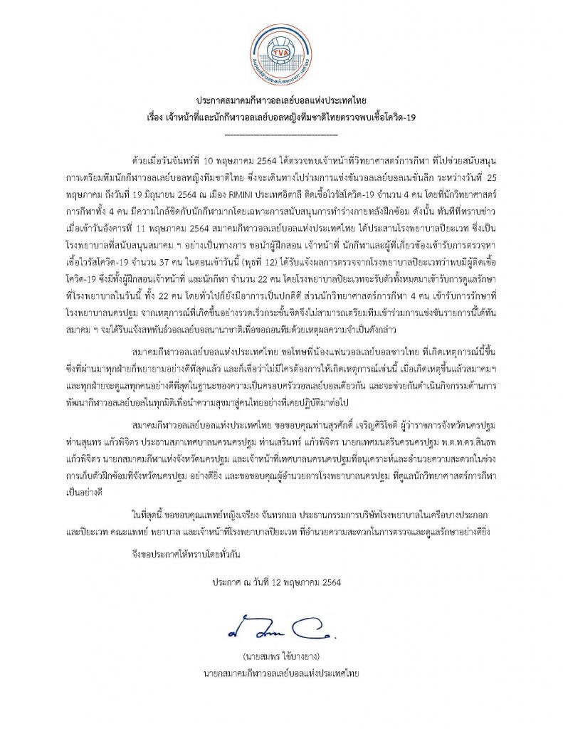 12 พ.ค.- สมาคมกีฬาวอลเลย์บอลแห่งประเทศไทย เผยผลตรวจโควิด-19 นักกีฬาวอลเลย์บอลหญิงทีมชาติไทยและเจ้าหน้าที่ พบติดเชื้อ 22 คน ต้องถอนทีมแข่งเนชั่นส์ลีก ที่อิตาลี ทั้งหมดเข้ารับการรักษาที่ รพ.ปิยะเวท
