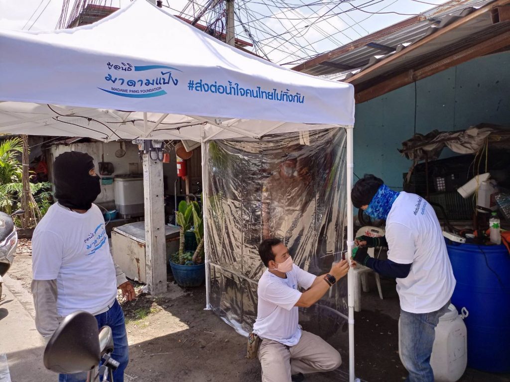 12 พ.ค.64-“มาดามแป้ง” นวลพรรณ ล่ำซำ ประธานกรรมการมูลนิธิมาดามแป้ง และประธานสโมสรการท่าเรือ เอฟซี กล่าวว่า จากสถานการณ์การแพร่ระบาดของเชื้อไวรัสโควิด-19 ที่กระจายไปหลายพื้นที่และทวีความรุนแรงขึ้นในเขตพื้นที่สีแดงของกรุงเทพมหานครอย่างเขตคลองเตยและเขตปทุมวัน นอกจากให้ความช่วยเหลือด้านอาหารจากครัวมาดาม กล่องน้ำใจแก่ผู้กักตัว การออกฉีดน้ำยาฆ่าเชื้อในพื้นที่ติดเชื้อต่อเนื่องทุกวันแล้ว ในช่วง 3 วันที่ผ่านมา มูลนิธิมาดามแป้ง ขอเสริมความมั่นใจให้ชาวบ้านที่ต้องดำเนินชีวิตประจำวันนอกบ้าน ท่ามกลางสถานการณ์ความเสี่ยง ด้วยการมอบหมายให้อาสาที่มีฝีมืองานช่าง ลงพื้นที่สร้างซุ้มพ่นน้ำยาฆ่าเชื้อจุดเข้า-ออก และจุดผ่านสำคัญภายในชุมชน