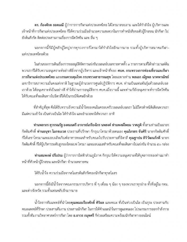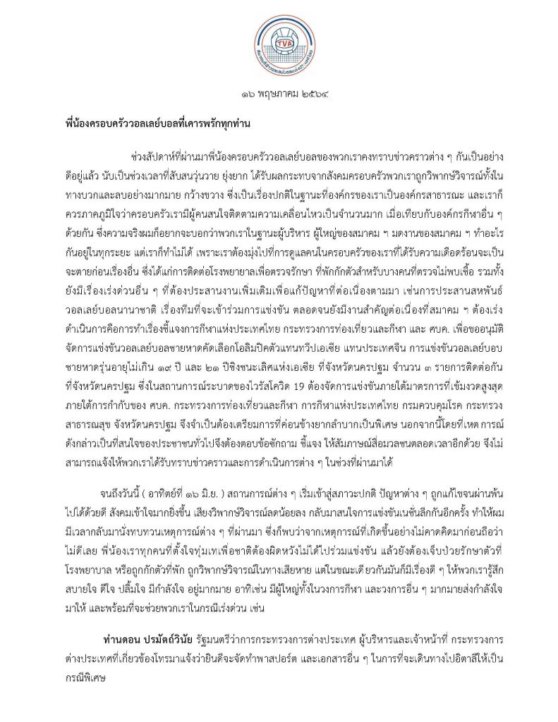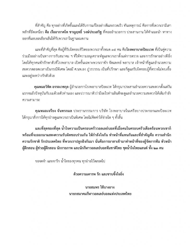 17 พ.ค 64-นายสมพร ใช้บางยาง นายกสมาคมกีฬาวอลเลย์บอลแห่งประเทศไทย ได้ออกแถลงการณ์ขอบคุณทุกกำลังใจที่ส่งมาให้ทีมวอลเลย์บอลสาวทีมชาติไทย ชุดลุยศึกเนชั่นส์ลีก ที่ประเทศอิตาลี ที่ติดโควิด-19 เมื่อวานนี้ ซึ่งทุกหน่วยงานและบุคลากรต่างๆรวมถึงครอบครัววอลเลย์บอลไทยได้สอบถามด้วยความเป็นห่วง และยังช่วยเหลือประสานงานจนทำให้สมาคมกีฬาวอลเลย์บอลแห่งประเทศไทย สามารถดำเนินการแก้ปัญหาดังกล่าว และสามารถส่งทีมเข้าร่วมการแข่งขันเนชั่นส์ลีกได้ ขอขอบคุณและซาบซึ้งใจอย่างยิ่ง