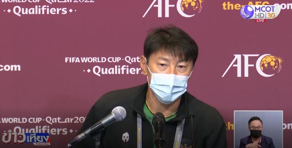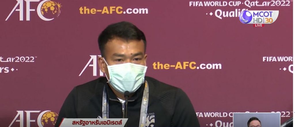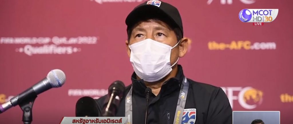 ก่อนเกมฟุตบอลโลก 2022 โซนเอเชีย รอบคัดเลือก รอบ 2 กลุ่มจี อากิระ นิชิโนะ กุนซือทีมชาติไทย พร้อมด้วย “บอย” ฉัตรชัย บุตรพรหม ผู้รักษาประตูของทีม ร่วมแถลงข่าวก่อนการแข่งขันระหว่างทีมชาติไทย พบ ทีมชาติอินโดนีเซีย ที่จะเตะคืนนี้ เวลา 23.45 น. (เวลาประเทศไทย) ที่สนามอัล มัคตูม สเตเดี้ยม