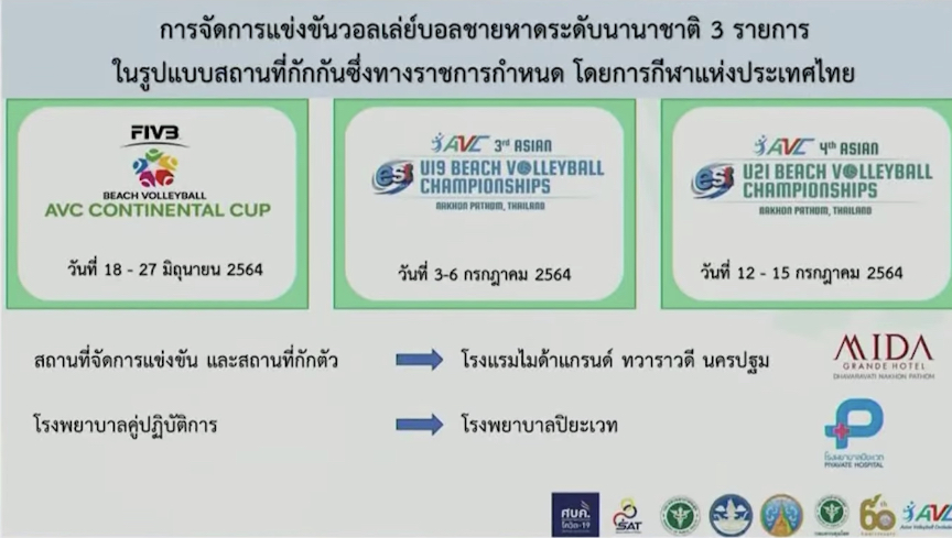 6 มิ.ย.64-สมาคมกีฬาวอลเลย์บอลแห่งประเทศไทย เตรียมตรวจความพร้อม และแถลงข่าวการจัดแข่งขันวอลเลย์บอลชายหาดในรายการนานาชาติ 3 รายการ ที่โรงแรมไมด้า แกรนด์ ทวารวดี จ.นครปฐม หลังจาก ศบค.อนุมัติให้ประเทศไทย รับหน้าเสื่อจัดการแข่งขันลูกยางชายหาด 3 รายการใหญ่ ระดับเอเชีย ที่ จ.นครปฐม ในช่วงเดือนมิถุนายน จนถึงเดือนกรกฎาคม ประกอบไปด้วยวอลเลย์บอลชายหาดคอนติเนนตัล คัพ 2020 (รอบคัดเลือกโอลิมปิกเกมส์), วอลเลย์บอลชายหาด อายุต่ำกว่า 19 ปีและ อายุต่ำกว่า 21 ปี ชิงชนะเลิศแห่งเอเชีย