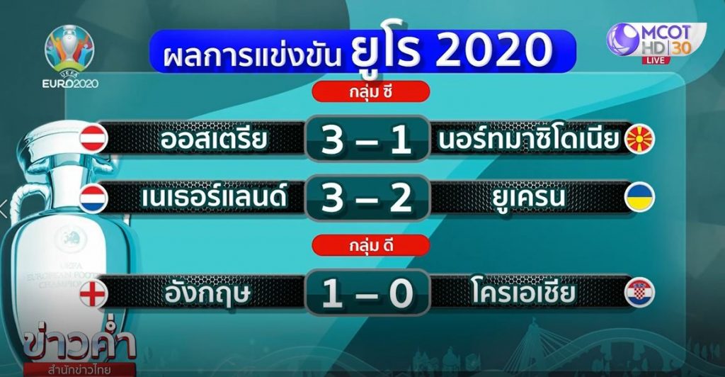 ส่วนผลอีก 2 คู่ กลุ่ม C ออสเตรีย ชนะ นอร์ทมาซิโดเนีย 3-1, เนเธอร์แลนด์ ชนะ ยูเครน 3-2 ส่วนโปรแกรมยูโร 2020 วันนี้ 20.00 น. กลุ่ม D : สกอตแลนด์-เช็ก, 23.00 น. กลุ่ม E : โปแลนด์-สโลวาเกีย, 02.00 น. กลุ่ม E : สเปน-สวีเดน