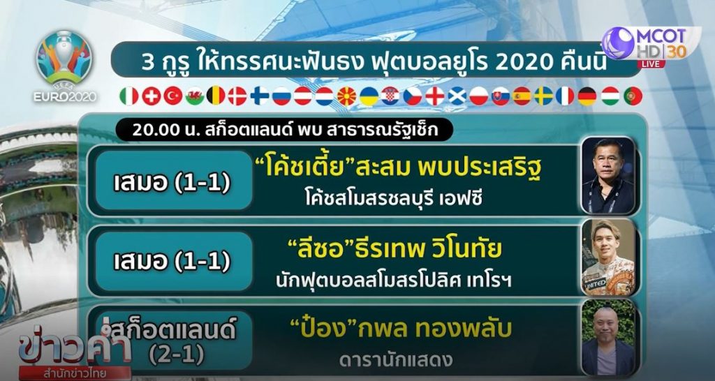 3 กูรูให้ทรรศนะฟันธงฟุตบอลยูโร 2020 คืนนี้ คู่ 20.00 น. สกอตแลนด์-เช็ก “โค้ชเตี้ย” สะสม พบประเสริฐ หัวหน้าผู้ฝึกสอนสโมสรชลบุรี เอฟซี และ “ลีซอ” ธีรเทพ วิโนทัย นักฟุตบอลสโมสรโปลิศ เทโรฯ มองว่าคู่นี้จะออกเสมอกัน ส่วน “ป๋อง” กพล ทองพลับ ดารา นักแสดง และนักจัดรายการวิทยุเอฟเอ็ม 99 มองว่า สกอตแลนด์จะเป็นฝ่ายเก็บชัยชนะ