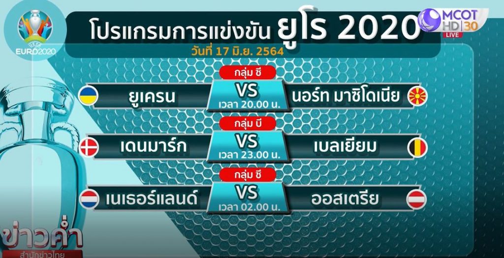 20.00 น. กลุ่มซี : ยูเครน-นอร์ท มาซิโดเนีย, 02.00 น. กลุ่มซี : เนเธอร์แลนด์-ออสเตรีย, กลุ่มบี : 23.00 น. เดนมาร์ก-เบลเยียม