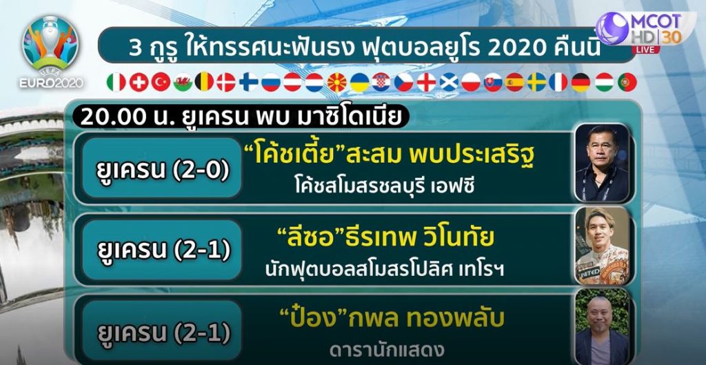 3 กูรู ให้ทรรศนะฟันธงฟุตบอลยูโร 2020 คืนนี้ คู่ 20.00 น. ยูเครน-นอร์ท มาซิโดเนีย “โค้ชเตี้ย” สะสม พบประเสริฐ หัวหน้าผู้ฝึกสอนสโมสรชลบุรี เอฟซี, “ลีซอ” ธีรเทพ วิโนทัย นักฟุตบอลสโมสรโปลิศ เทโรฯ และ “ป๋อง” กพล ทองพลับ ดารา นักแสดง และนักจัดรายการวิทยุ เอฟเอ็ม 99 มองไปในทิศทางเดียวกันว่ายูเครนจะเป็นฝ่ายเอาชนะไปได้