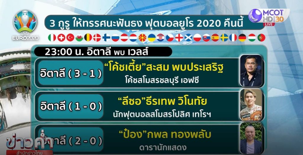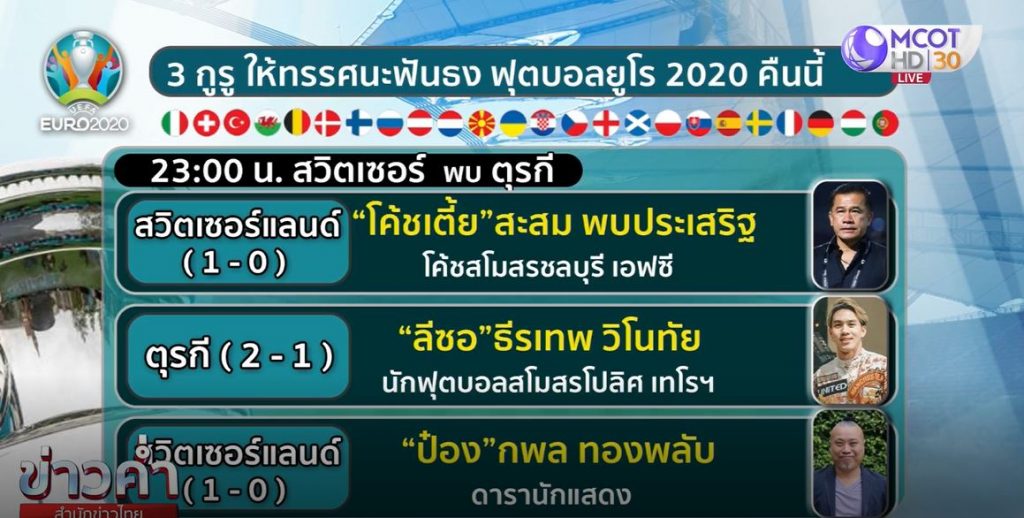 3 กูรูให้ทรรศนะฟันธง ฟุตบอลยูโร 2020 คืนนี้ “โค้ชเตี้ย” สะสม พบประเสริฐ หน.ผู้ฝึกสอนสโมสรชลบุรี เอฟซี กับ “ป๋อง” กพล ทองพลับ ดารา นักแสดง และนักจัดรายการวิทยุเอฟเอ็ม 99 มองไปในทิศทางเดียวกันว่าสวิตเซอร์แลนด์น่าจะเบียดชนะตุรกีได้ ซึ่งตรงข้ามกับ “ลีซอ” ธีรเทพ วิโนทัยนักฟุตบอลสโมสรโปลิศ เทโรฯ ที่มองว่าตุรกีจะชนะได้