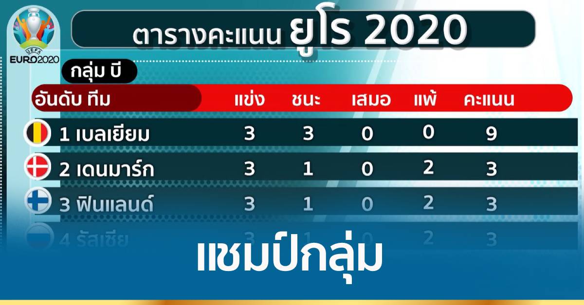 ศึกยูโร 2020 นัดส่งท้าย รอบแรก กลุ่มบี ที่สนามเซนต์ ปีเตอร์สเบิร์ก สเตเดียม ประเทศรัสเซีย ทีมชาติเบลเยียม ที่ต้องการอีก 1 แต้ม เพื่อการันตีการคว้าแชมป์กลุ่ม ลงสนามพบ ฟินแลนด์ ครึ่งหลัง “ปีศาจแดงแห่งยุโรป” ขึ้นนำ 1-0 ในนาทีที่ 74 โธมัส แฟร์มาเลน ขึ้นโหม่งบอลไปชนเสาก่อนจะกระดอนมาโดนมือของ ฮราเดคกี เข้าประตูตัวเองไป ท้ายเกมนาทีที่ 81 โรเมลู ลูกากู ยิงให้เบลเยียมหนีไปเป็น 2-0 และคว้าชัยไปด้วยสกอร์นี้ ทำให้เบลเยียมมี 9 คะแนนเต็ม จาก 3 นัดเข้าสู่รอบ 16 ทีมสุดท้ายในฐานะแชมป์กลุ่ม ส่วน ฟินแลนด์ มี 3 คะแนน ต้องไปลุ้นเข้ารอบในฐานะทีมันดับที่ 3 ที่ดีที่สุดต่อไป