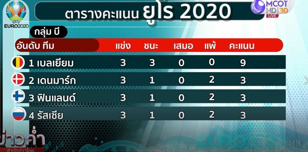 รัสเซีย 22 มิ.ย. – เบลเยียมยังร้อนแรง ส่วนเดนมาร์กถล่มรัสเซียพลิกเข้ารอบฟุตบอลยูโร 2020 ส่วนคืนนี้มีเตะ 2 คู่ อังกฤษ ลงสนามพบกับสาธารณรัฐเช็ก