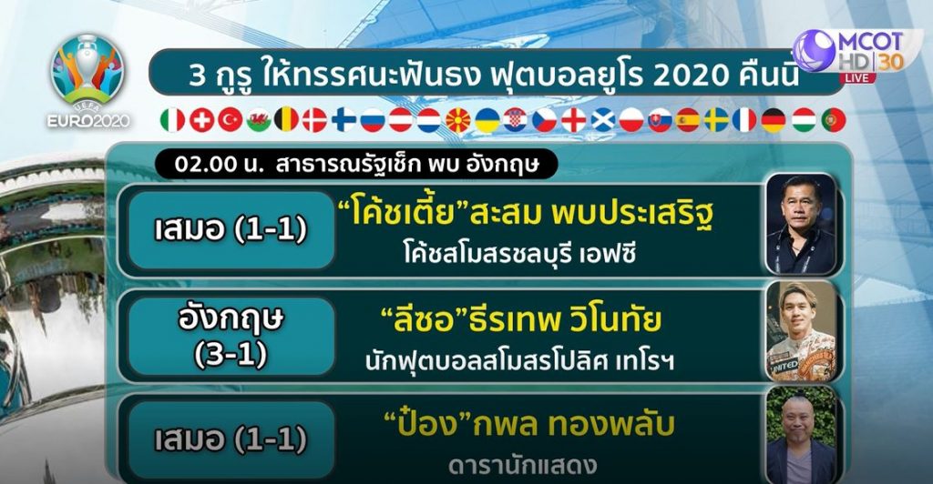 3 กูรูให้ทรรศนะฟันธงฟุตบอลยูโร 2020 คืนนี้ คู่เช็ก กับอังกฤษ “โค้ชเตี้ย” สะสม พบประเสริฐ กับ “ป๋อง” กพล ทองพลับ ให้เสมอกัน ส่วน “ลีซอ” ธีรเทพ วิโนทัย ให้อังกฤษชนะ ส่วนคู่ของ โครเอเชีย กับ สกอตแลนด์ “โค้ชเตี้ย” สะสม ให้เสมอกัน แต่ “ลีซอ” ธีรเทพ กับ ”ป๋อง” กพล ให้สกอตแลนด์ชนะ.-สำนักข่าวไทย