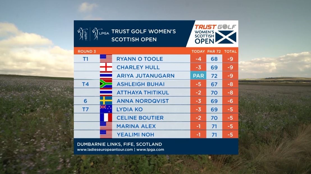 กอล์ฟแอลพีจีเอ ทัวร์ รายการ “ทรัสต์ กอล์ฟ วีเมนส์ สกอตติช โอเพ่น” ที่สกอตแลนด์ จบวันที่ 3 “โปรเม” เอรียา จุฑานุกาล โปรสาวขวัญใจชาวไทย อดีตแชมป์รายการนี้เมื่อปี 2018 พลาดตีเสีย 2 โบกี้ ในหลุม 17 และ 18 จบที่อีเวนพาร์ สกอร์รวม 9 อันเดอร์พาร์ แต่ยังรั้งตำแหน่งผู้นำ ร่วมกับ ไรอันน์ โอ ทูเล จากสหรัฐ และ ชาร์ลีย์ ฮัลล์ จากอังกฤษ