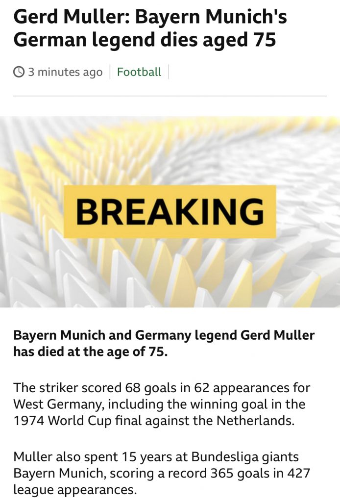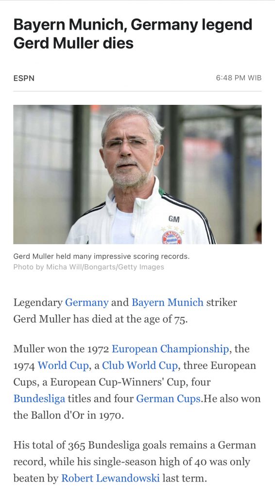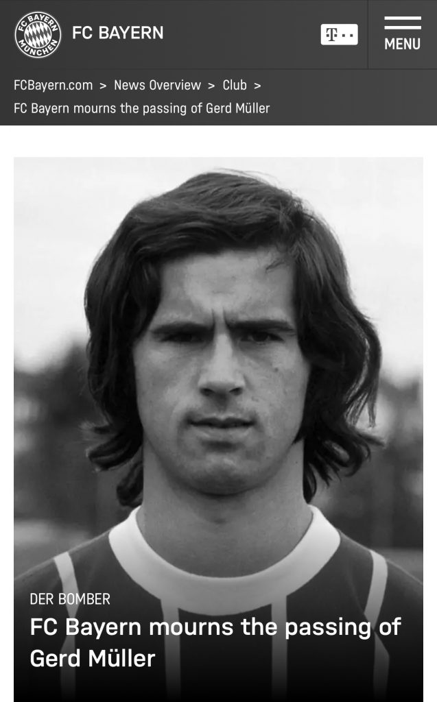 เยอรมนี 15 ส.ค.64-สโมสรบาเยิร์นมิวนิค แถลงการณ์ว่า สโมสรและแฟนๆ ทุกคนต่างไว้อาลัยให้กับการเสียชีวิตของ แกร์ด มุลเลอร์ ที่เสียชีวิตในเช้าวันอาทิตย์ ตามเวลาท้องถิ่น ด้วยวัย 75 ปี