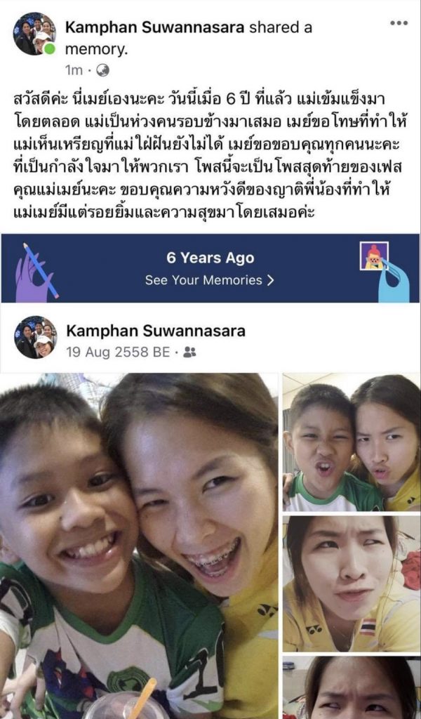 “สวัสดีค่ะ นี่เมย์เองนะคะ วันนี้เมื่อ 6 ปี ที่แล้ว แม่เข้มแข็งมาโดยตลอด แม่เป็นห่วงคนรอบข้างมาเสมอ เมย์ขอโทษที่ทำให้แม่เห็นเหรียญที่แม่ใฝ่ฝันยังไม่ได้ เมย์ขอขอบคุณทุกคนนะคะที่เป็นกำลังใจมาให้พวกเรา โพสนี้จะเป็นโพสสุดท้ายของเฟสคุณแม่เมย์นะคะ ขอบคุณความหวังดีของญาติพี่น้องที่ทำให้แม่เมย์มีแต่รอยยิ้มและความสุขมาโดยเสมอค่ะ”-สำนักข่าวไทย