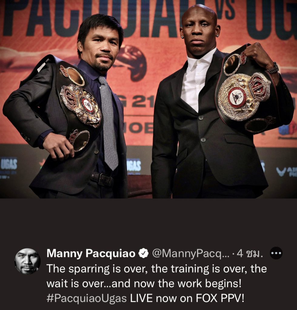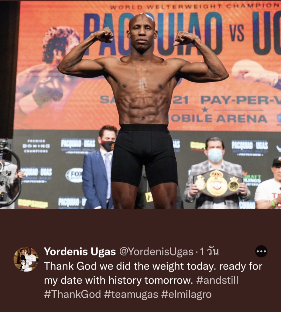 มวยสากลศึกชิงแชมป์โลกรุ่นเวลเตอร์เวต สมาคมมวยโลก(WBA) ที่นครลาสเวกัส รัฐเนวาดา ประเทศ สหรัฐอเมริกา แมนนี ปาเกียว นักชกชาวฟิลิปปินส์ วัย 42 ปี ที่ไม่ได้ชกมา 763 วัน ตั้งแต่ชนะ คีธ เธอร์แมน เมื่อเดือนกรกฎาคมปี2019 พบกับ ยอร์เดนิส อูกัส เจ้าของแชมป์โลกชาวคิวบา ที่ได้ขึ้นชกไฟต์นี้แทน เออร์โรล สเปนซ์ จูเนียร์ แชมป์โลก 2 สถาบันชาวสหรัฐ ที่บาดเจ็บเรตินานัยน์ตาจนต้องถอนตัว