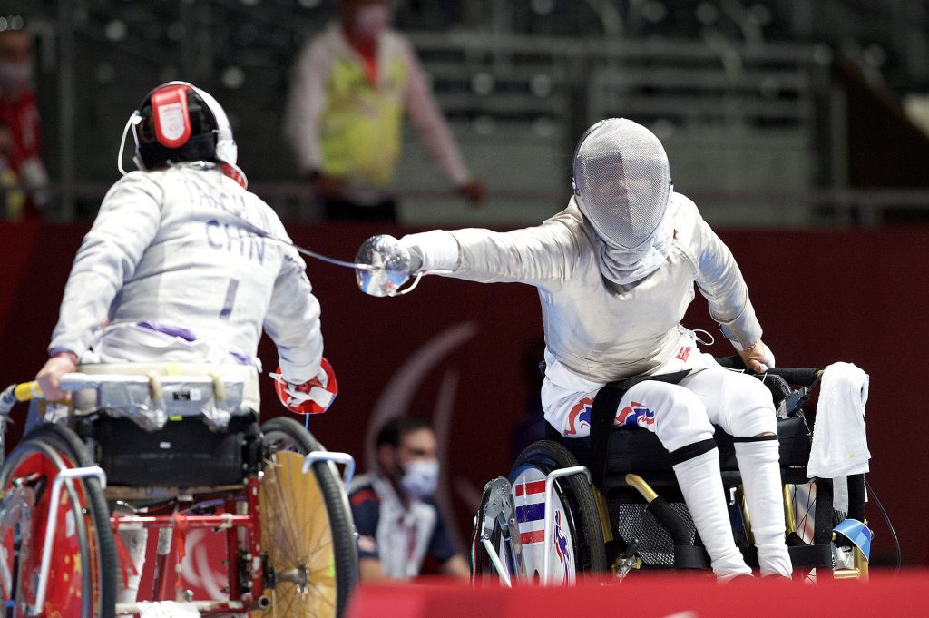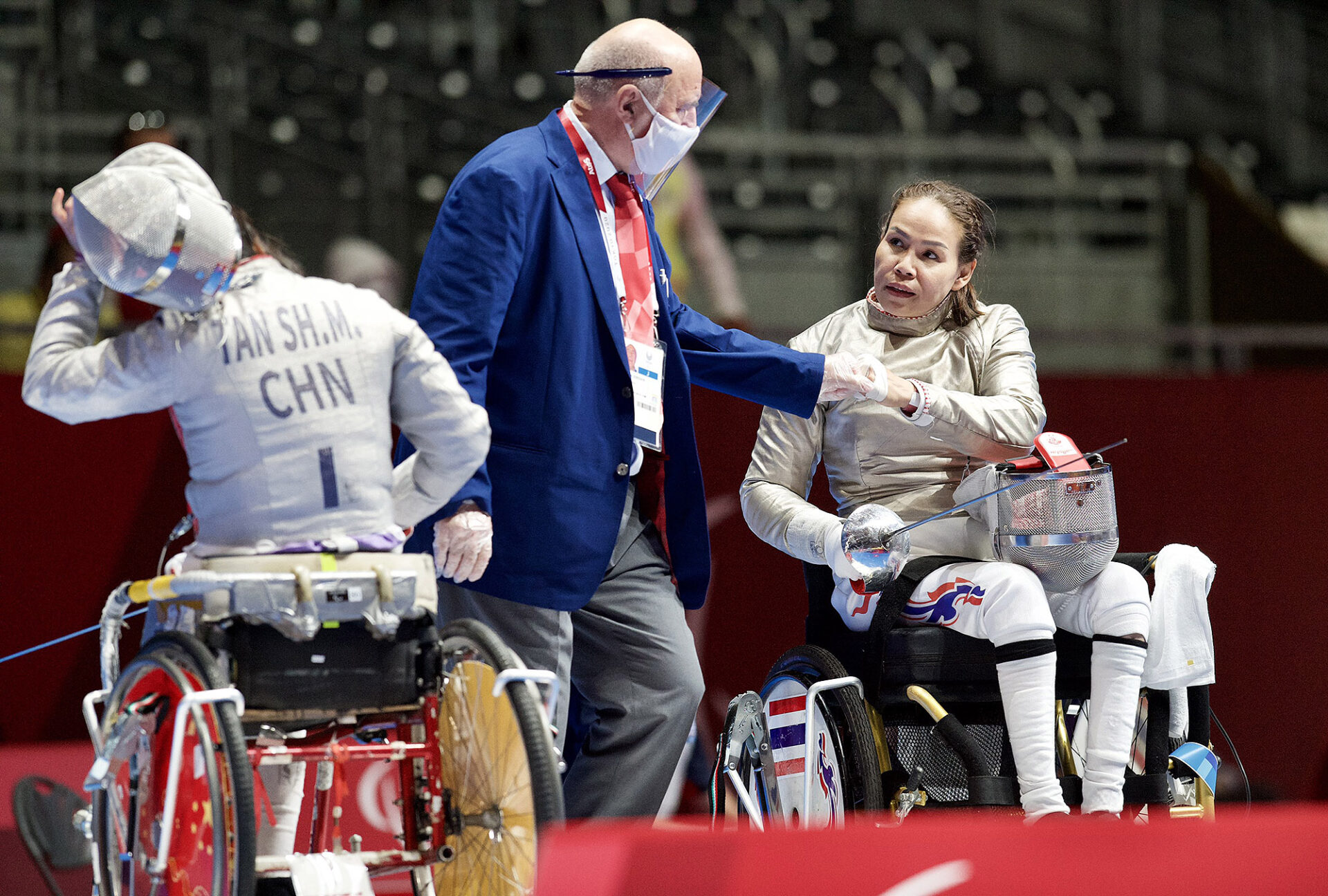 ญี่ปุ่น 25 ส.ค.64- กีฬาพาราลิมปิกเกมส์ 2020 วีลแชร์ฟันดาบ ประเภทดาบเซเบอร์ บุคคลหญิง คลาสบี รอบ 16 คนสุดท้ายที่มาคุฮาริ เมสเซ กรุงโตเกียว “แวว” สายสุนีย์ จ๊ะนะ นักวีลแชร์ฟันดาบสาวไทยวัย 47 ปี ชาว จ.เชียงใหม่ พบกับ เทียน ซู เม่ย นักดาบจีนวัย 32 ปี มือวางอันดับ 2 ของรายการ โดย สายสุนีย์ พ่ายสาวจีนไป 11-15 คะแนน ต้องยุติเส้นทางดาบเซเบอร์ บุคคลหญิง คลาสบี ไว้ที่รอบก่อนรองชนะเลิศ