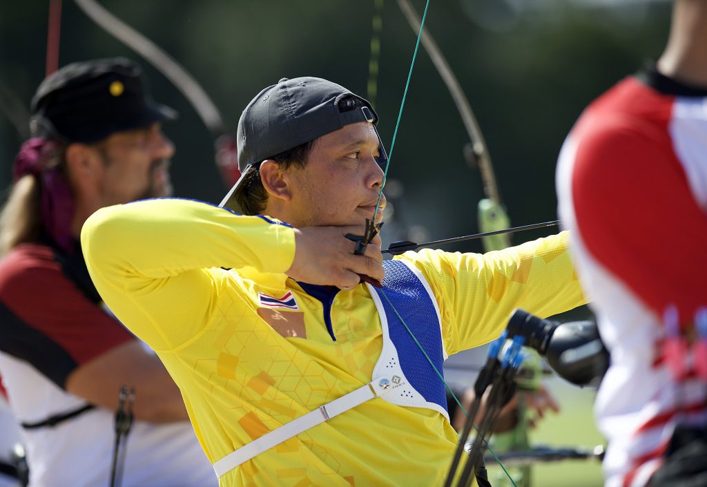ประเภทคันธนูทดกำลัง บุคคลชาย ยืนยิง อานนท์ อึ้งอภินันท์ ยิงได้ 686 คะแนน เป็นสถิติที่ดีที่สุดของตัวเอง จบอันดับที่ 15 จากนักกีฬา 36 คน ผ่านเข้ารอบ 16 คนสุดท้ายไปพบกับ แวน มอลตากู ปียอร์เตอร์ จากเบลเยียม ในวันที่ 28 สิงหาคม เวลา 11.13 น. ตามเวลาเมืองไทย ส่วน คมสัน สิงห์ภิรมย์ ยิงได้ 671 คะแนน จบอันดับที่ 27 ผ่านเข้ารอบ 16 คนสุดท้าย ไปพบกับ อ้าย ซิน เหลียน จากจีน ในวันที่ 28 สิงหาคม เวลา 09.16 น.