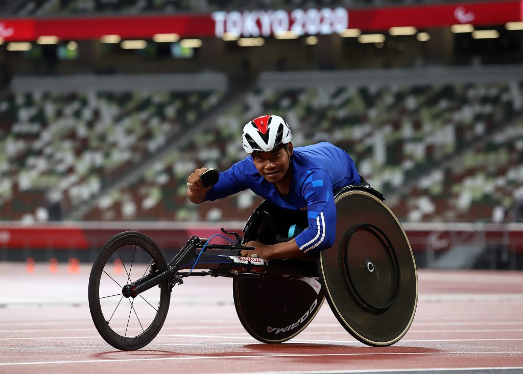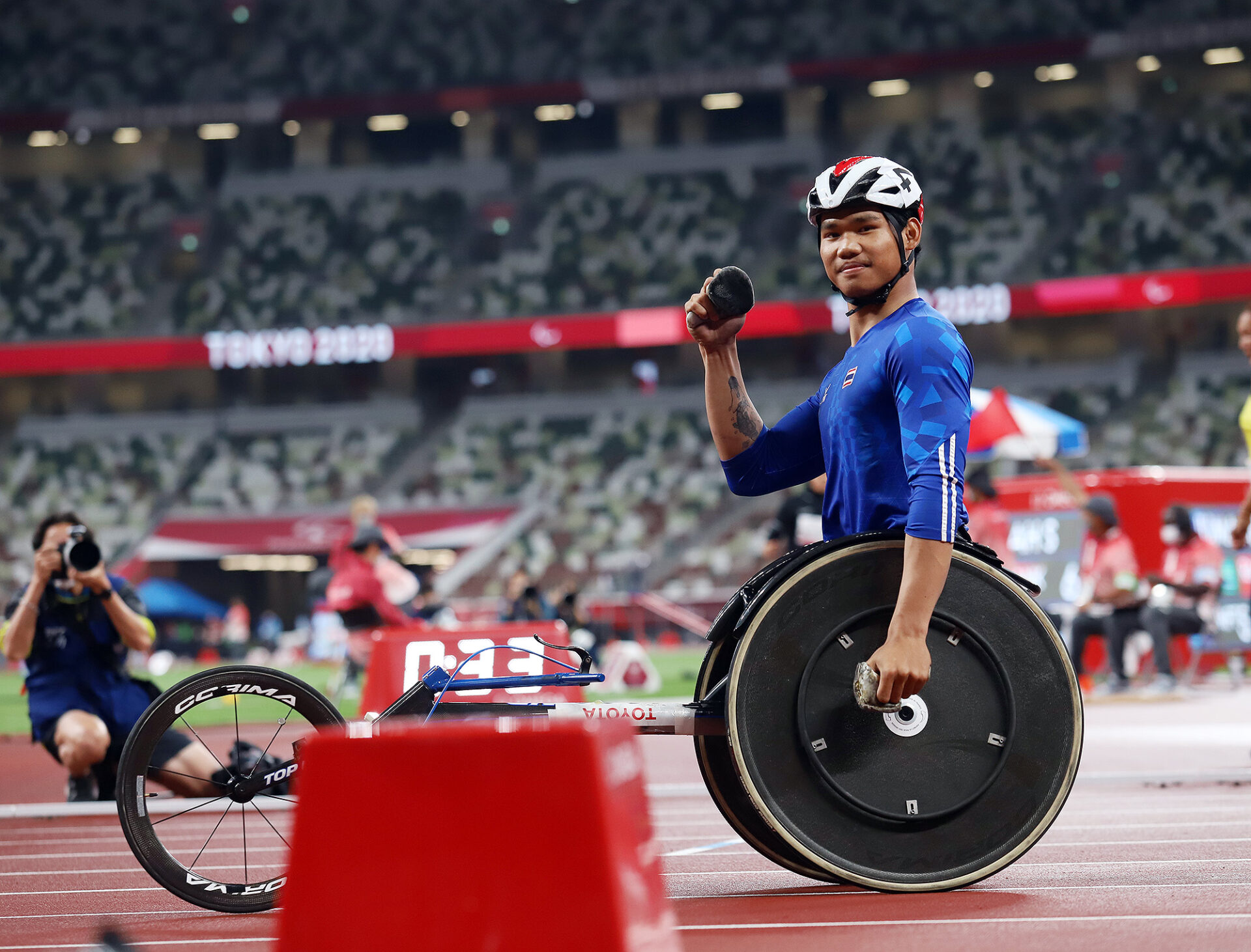 ขณะที่พงศกร แปยอ นักวีลแชร์เรซซิ่งพาราไทย ควบวีลแชร์เข้าเส้นชัยเวลา 14.20 วินาที ในกรีฑา 100 เมตร ชาย คลาส T53 ทำลายสถิติพาราลิมปิกของตัวเอง คว้าเหรียญทองที่สองให้กับตัวเองและทัพนักกีฬาไทย ในพาราลิมปิก ที่โอลิมปิก สเตเดี้ยม ประเทศญี่ปุ่น. – สำนักข่าวไทย