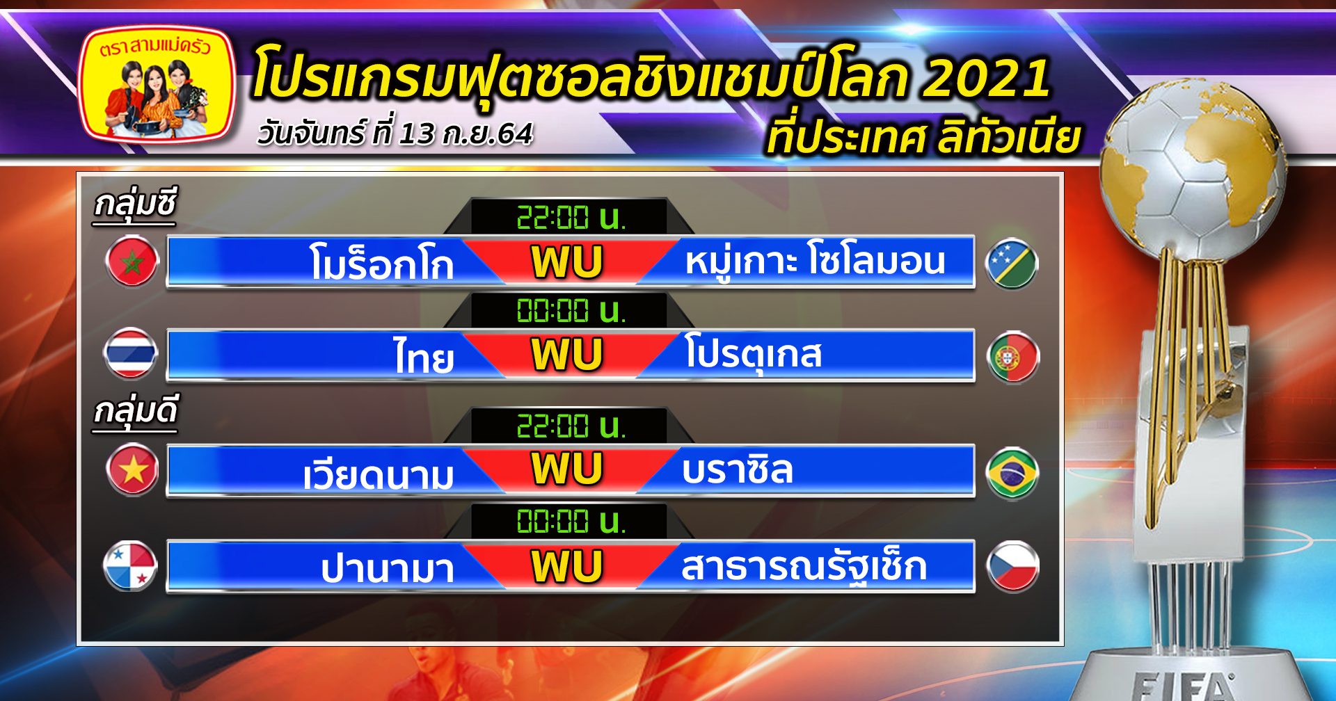 สำหรับโปรแกรมการแข่งขันรอบแรกในกลุ่มซี คืนนี้ นอกจากทีมไทยแล้ว เวลา 22.00 น. โมร็อกโก จะพบ หมู่เกาะโซโลมอน