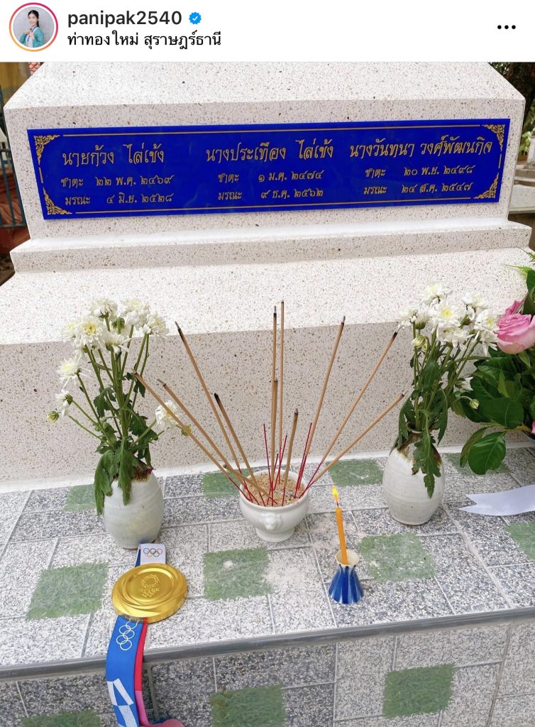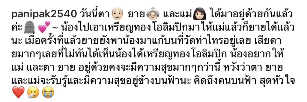 “วันนี้ตา👴🏻 ยาย👵🏻 และแม่👩🏻 ได้มาอยู่ด้วยกันแล้วค่ะ🪦💕~ น้องไปเอาเหรียญทองโอลิมปิกมาให้แม่แล้วก็ยายได้แล้วนะ เมื่อครั้งที่แล้วยายยังพาน้องมาแก้บนที่วัดท่าไทรอยู่เลย เสียดายมากๆเลยที่ไม่ทันได้เห็นน้องได้เหรียญทองโอลิมปิก น้องอยากให้แม่ และตา ยาย อยู่ด้วยคงจะมีความสุขมากๆกว่านี้ หวังว่าตา ยาย และแม่จะรับรู้และมีความสุขอยู่ข้างบนฟ้านะ คิดถึงคนบนฟ้า สุดหัวใจ❤️🤧😭”