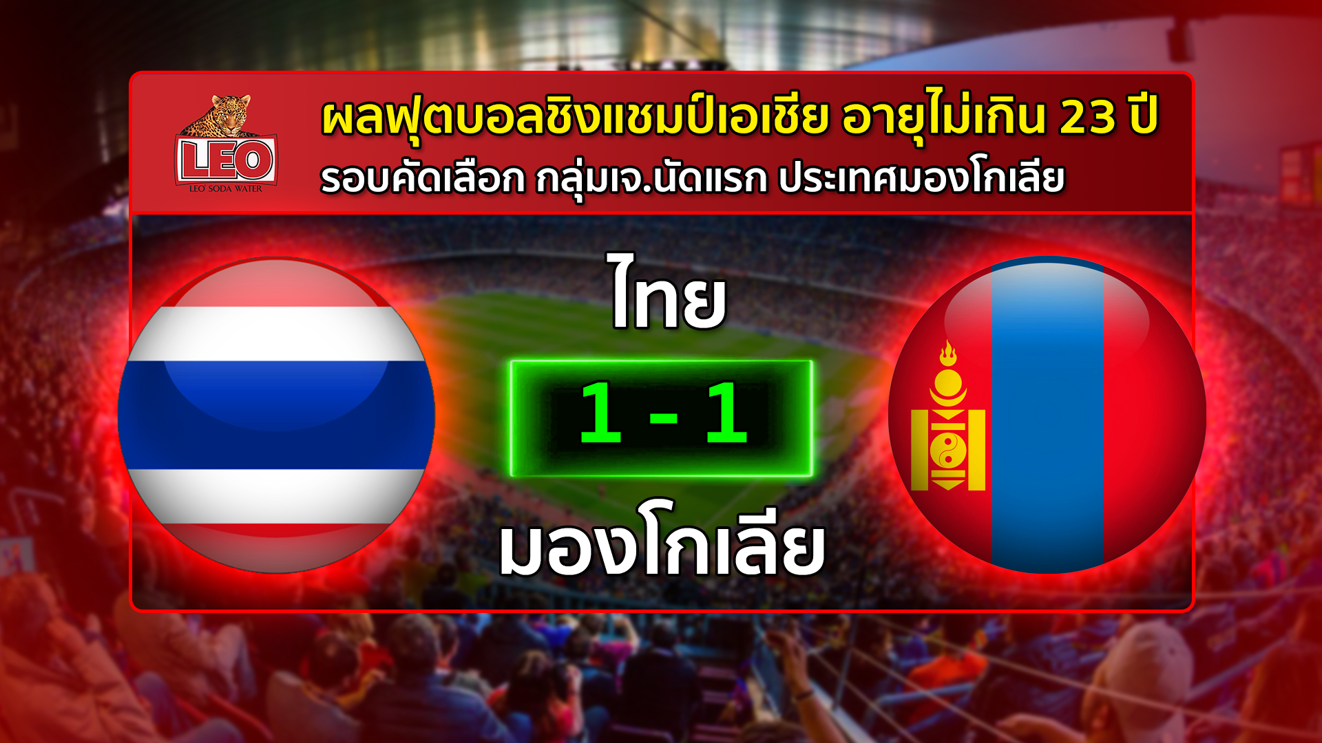 มองโกเลีย 25 ต.ค.- ทีมฟุตบอลทีมชาติไทย รุ่นอายุไม่เกิน 23 ปี เสมอ มองโกเลีย 1-1 ในศึกฟุตบอลชิงแชมป์เอเชีย รอบคัดเลือก กลุ่ม เจ นัดแรก ที่สนามเอ็มเอฟเอฟ ฟุตบอล เซนเตอร์ กรุงอูลานบาตอร์ ประเทศมองโกเลีย ในนาทีที่ 11 ทีมไทยได้ประตูขึ้นนำ 1-0 จาก จักรกริช พาละพล ด้าน วันชาติ ชูสงค์ แพทย์ยืนยันต้องพักอย่างน้อย 3-6 เดือน