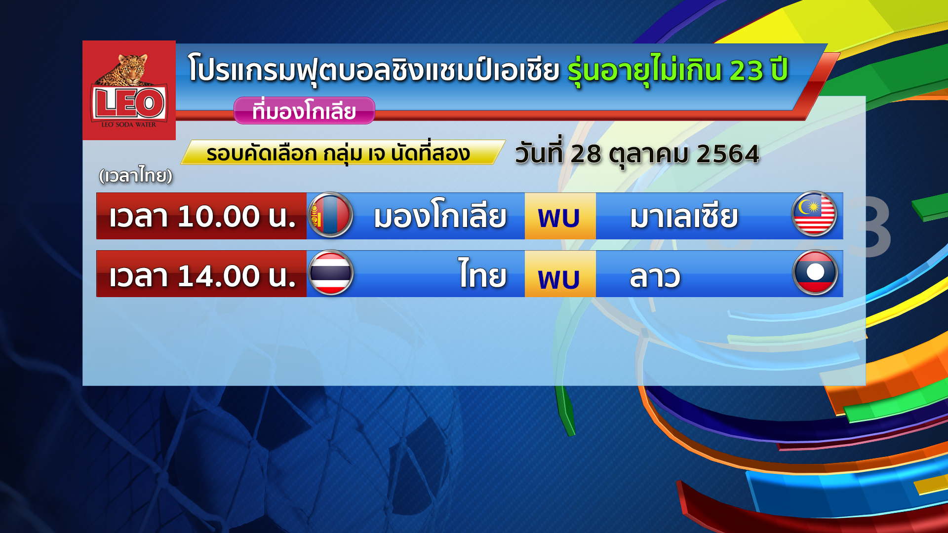 สำหรับโปรแกรมฟุตบอลชิงแชมป์เอเชียรุ่นอายุไม่เกิน 23 ปี รอบคัดเลือก กลุ่ม เจ นัดที่สอง วันที่ 28 ตุลาคม 2564