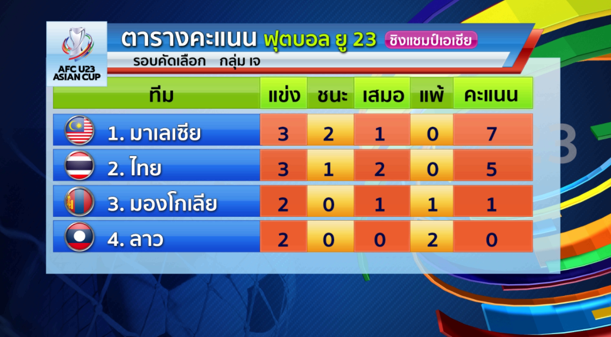 สรุปตารางคะแนนกลุ่มนี้ มาเลเซีย คว้าแชมป์กลุ่ม เตะ 3 นัด ชนะ 2 เสมอ 1 มี 7 คะแนน ส่วนทีมชาติไทย ชนะ 1 เสมอ 2 มี 5 คะแนน ต้องไปลุ้นให้ลาว เอาชนะ มองโกเลีย ในเวลา 14.00 น. วันนี้ เพื่อไปลุ้นเข้ารอบในฐานะอันดับ 2 ดีที่สุดต่อไป.-สำนักข่าวไทย